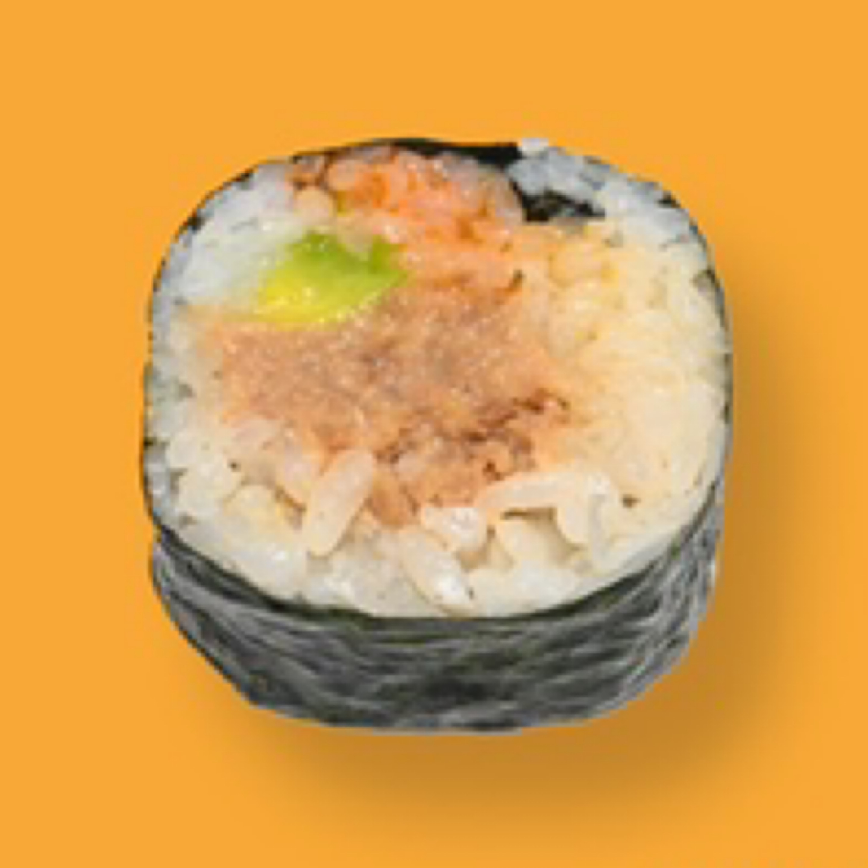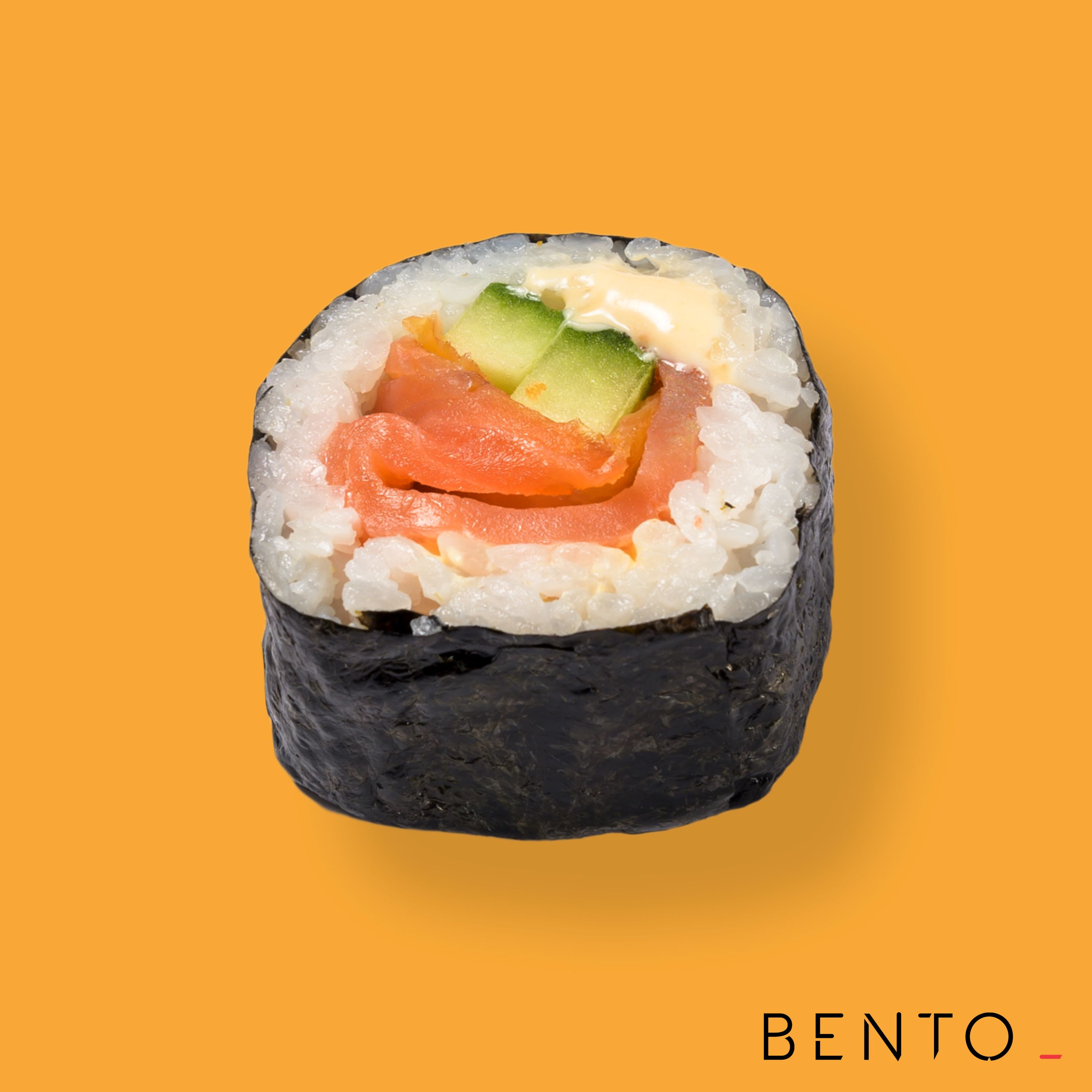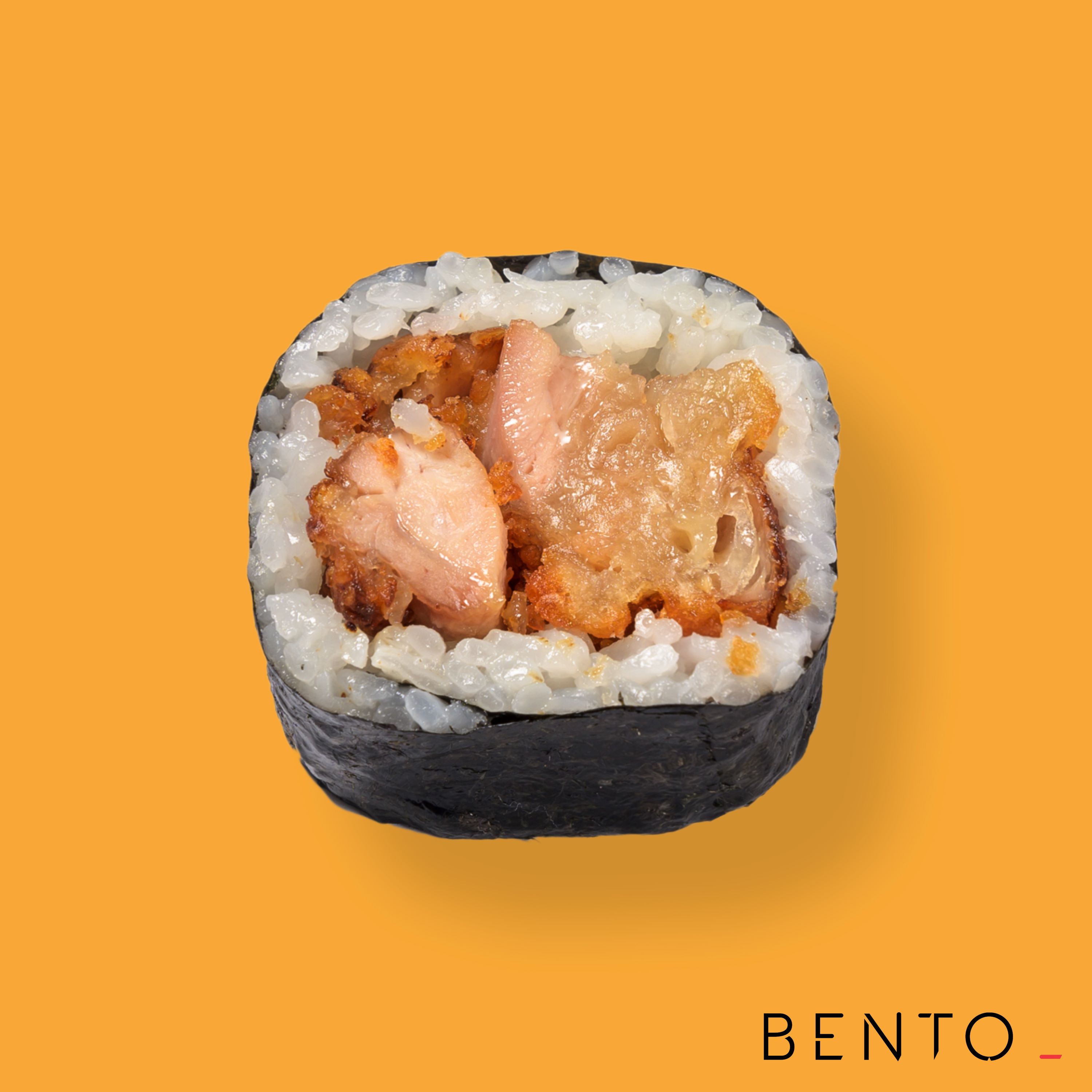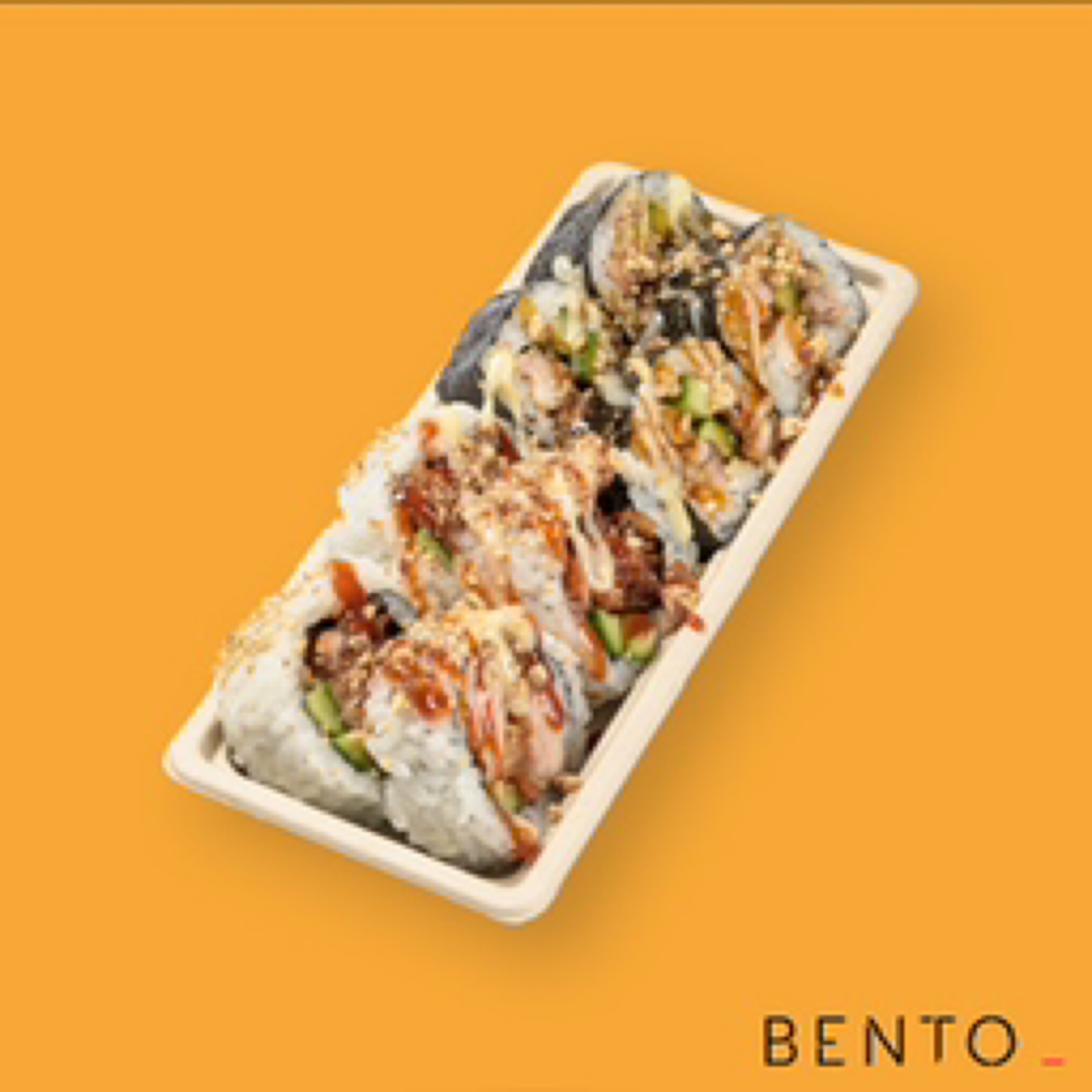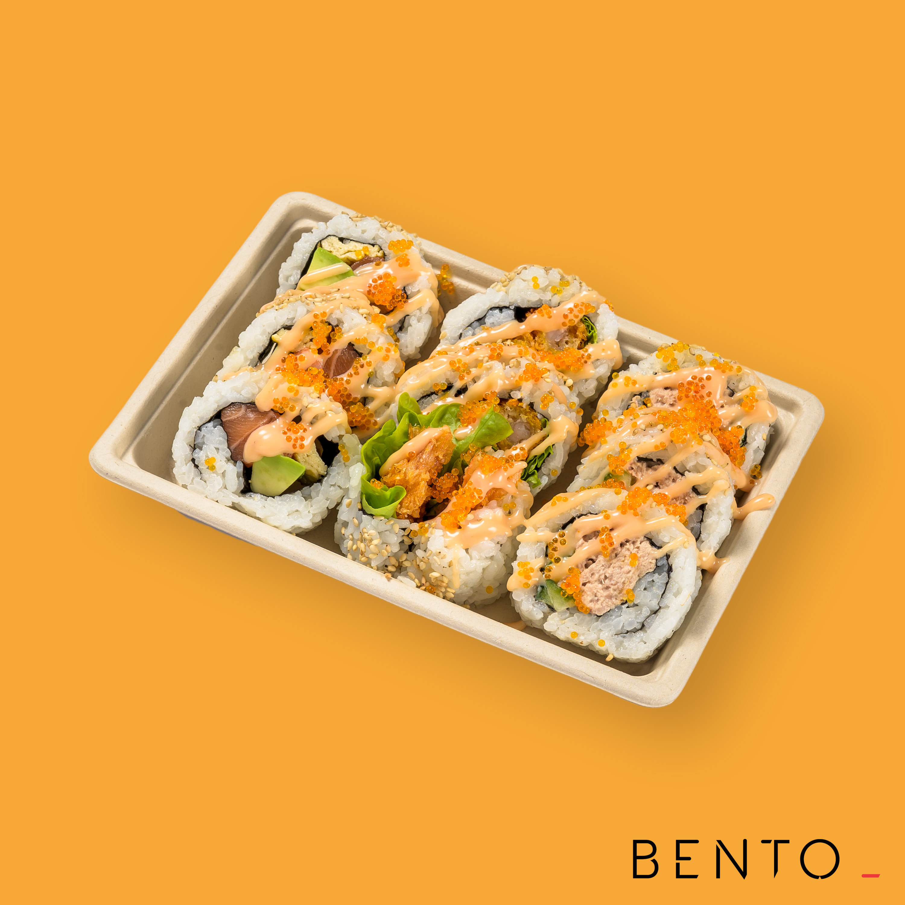 Salmon roll, cooked tuna roll and fried prawn roll topped with Bento aurora sauce.
