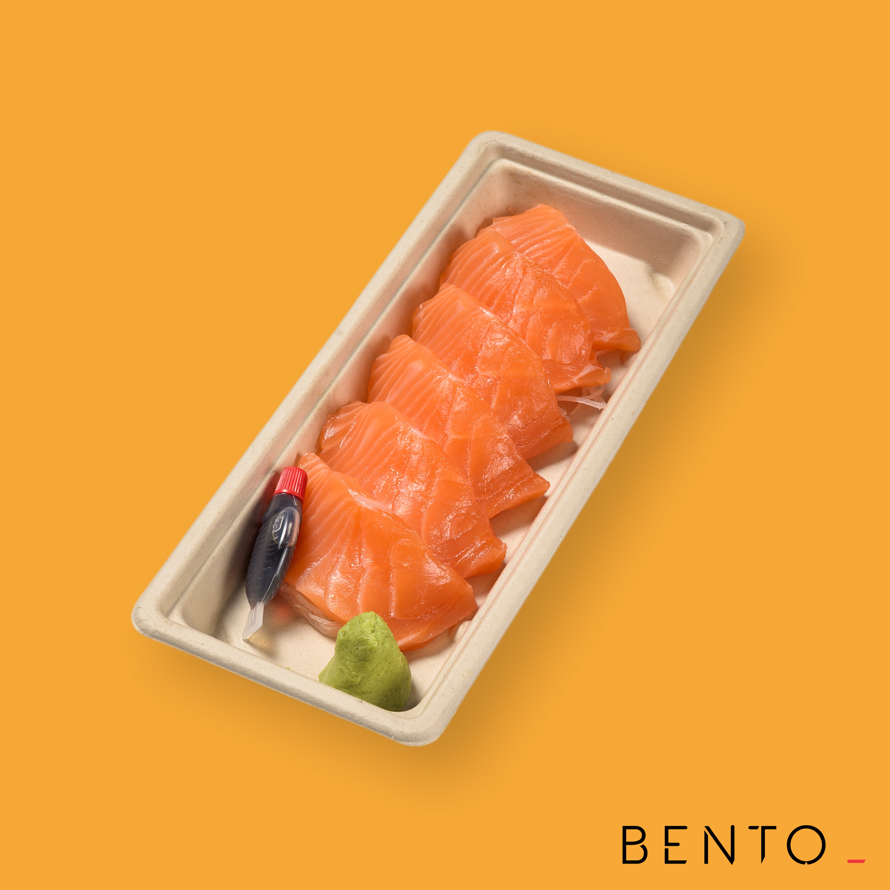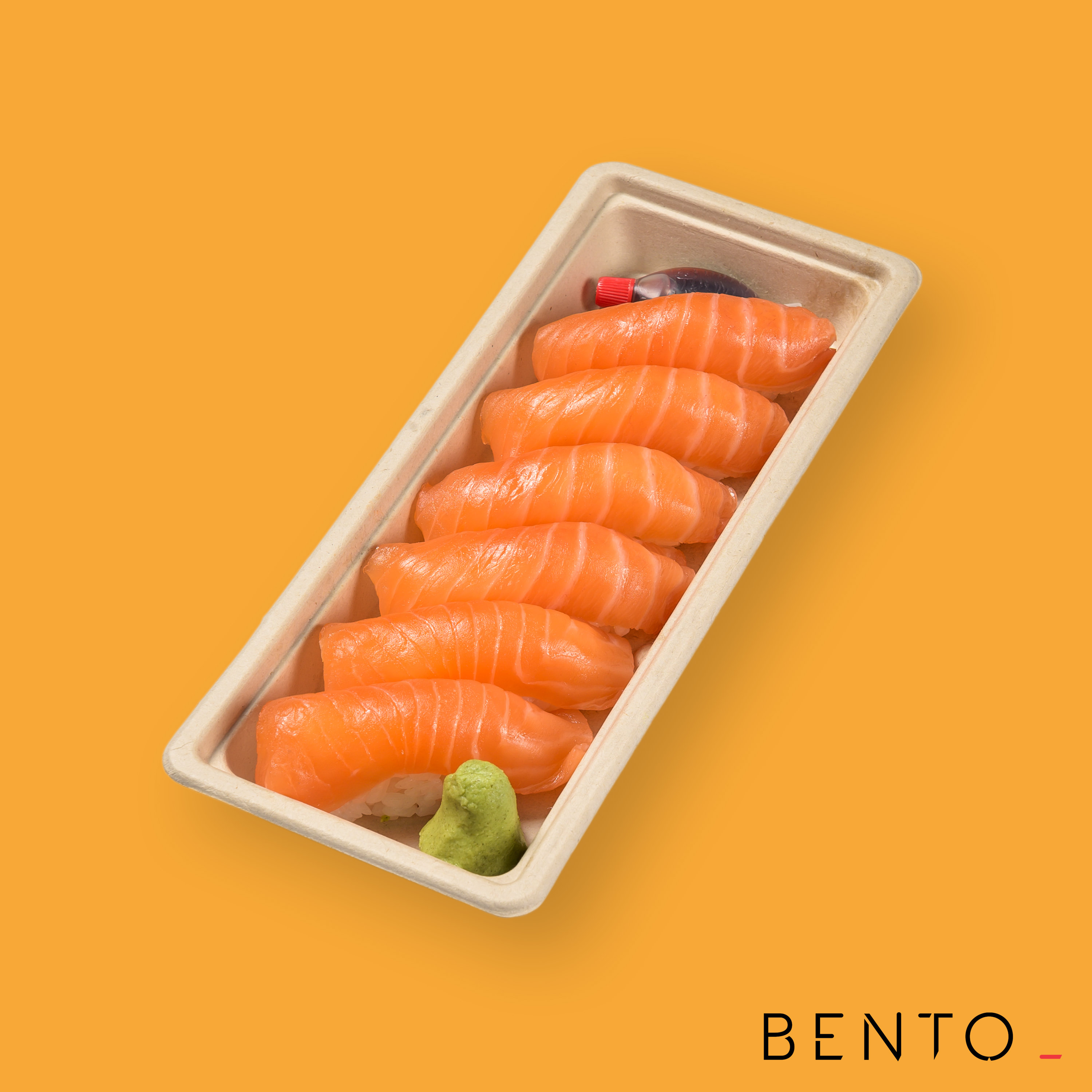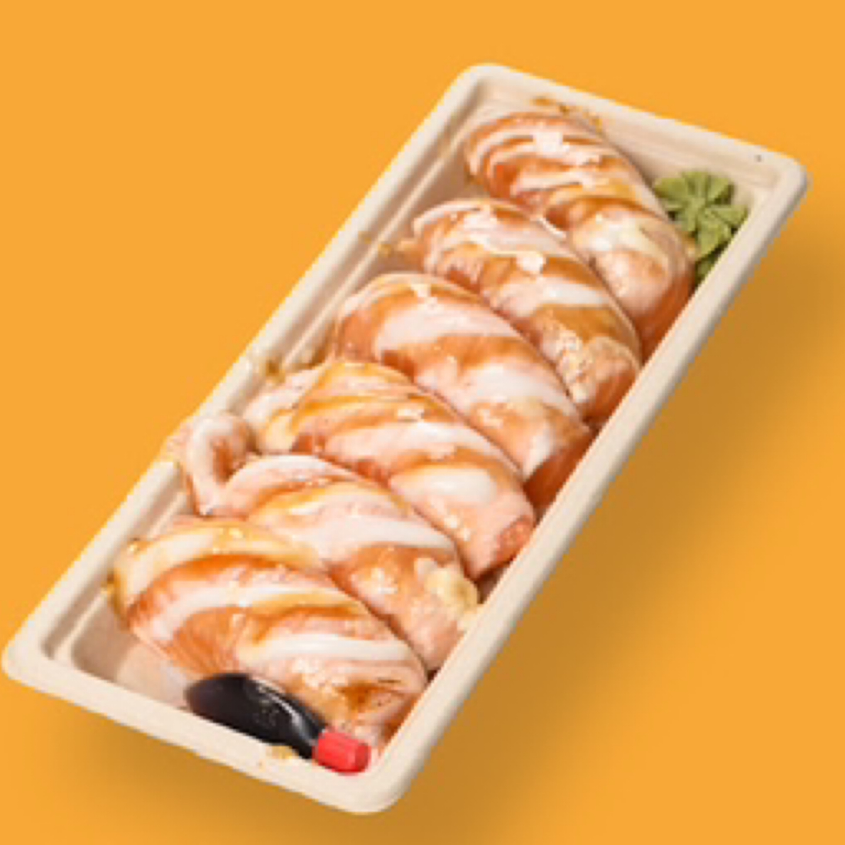 6 Pieces of fresh salmon on a bed of sushi rice.