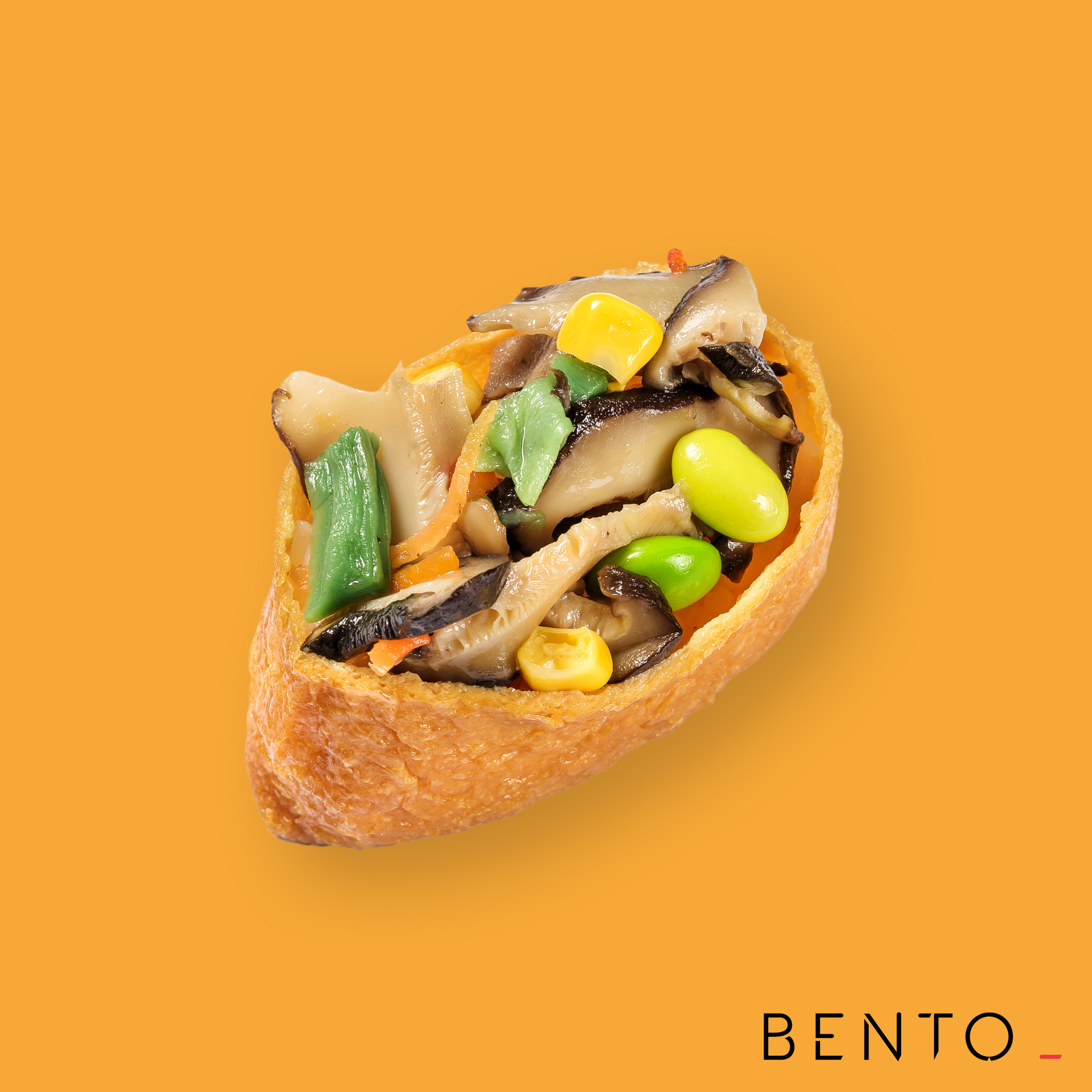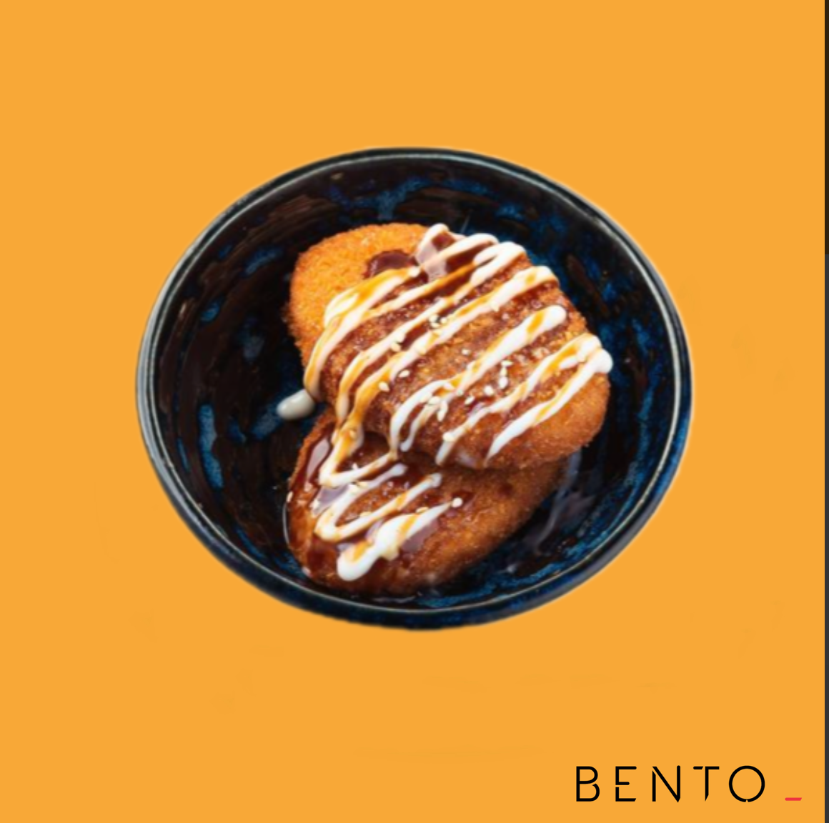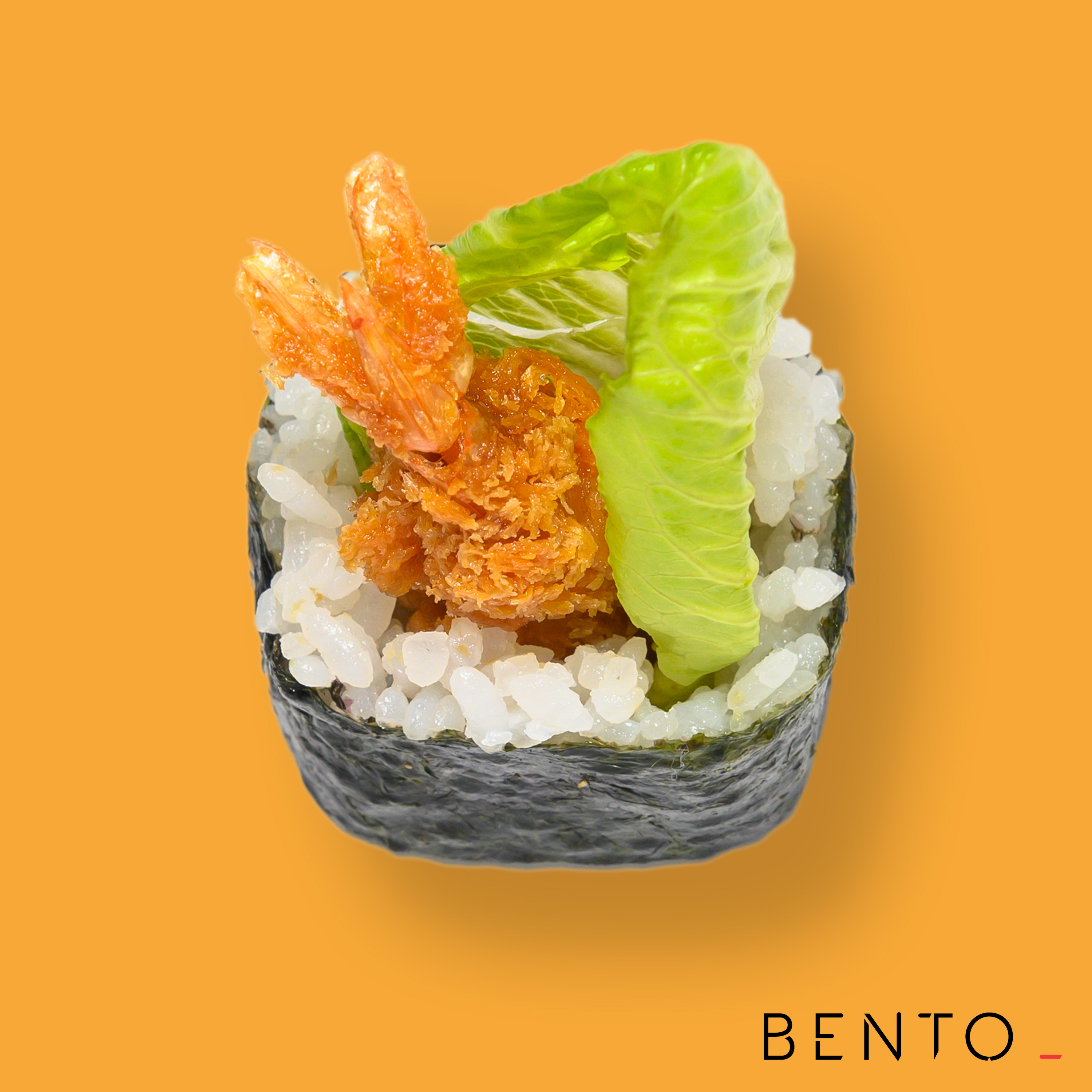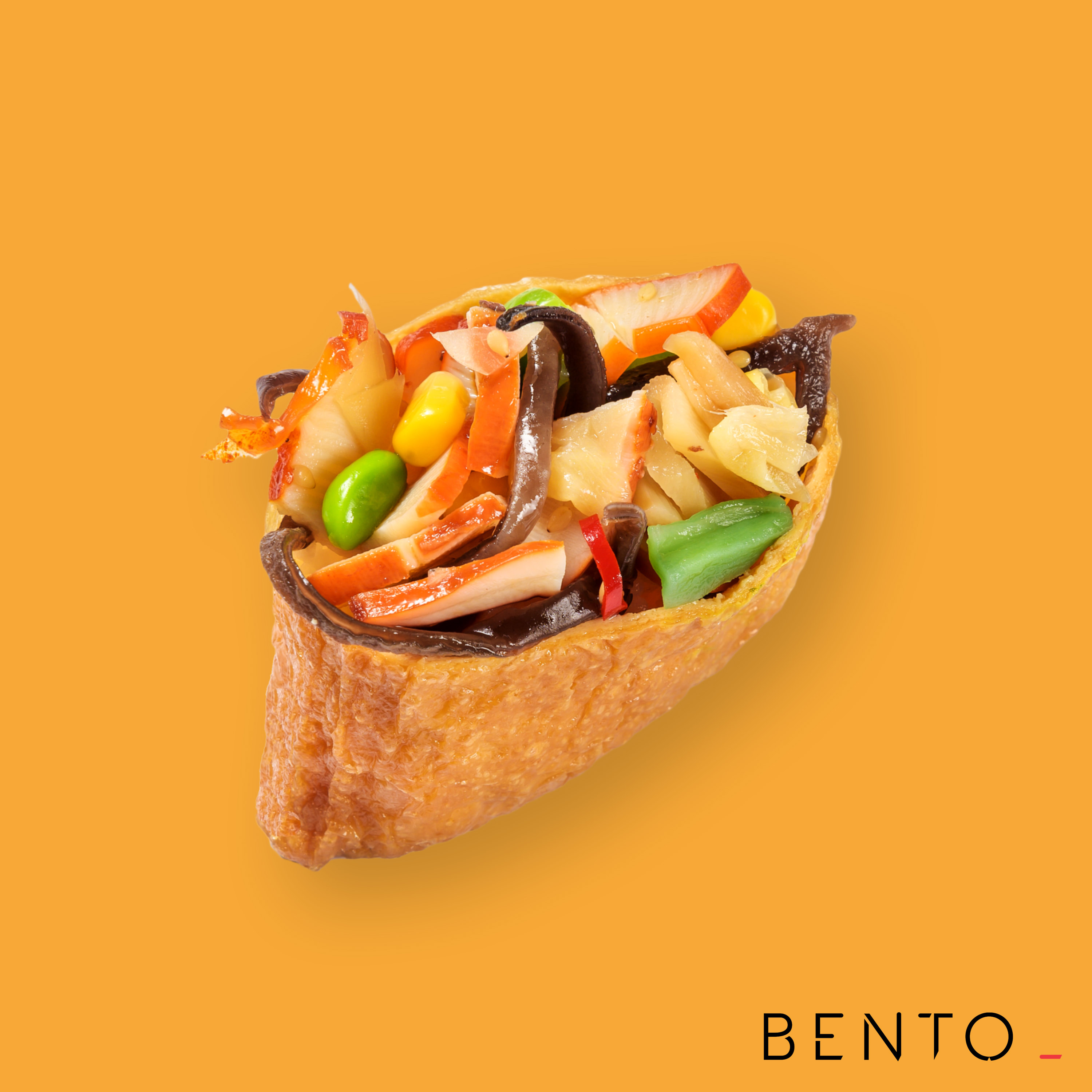Fried prawn in a sushi rice filled Japanese sweet tofu pocket topped with Bento aurora sauce.