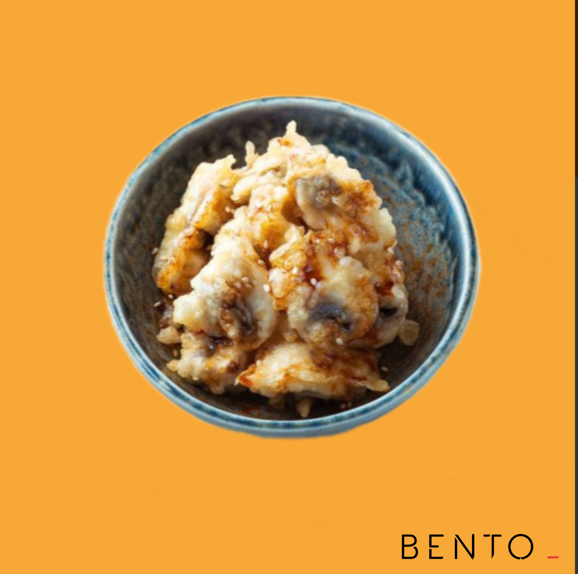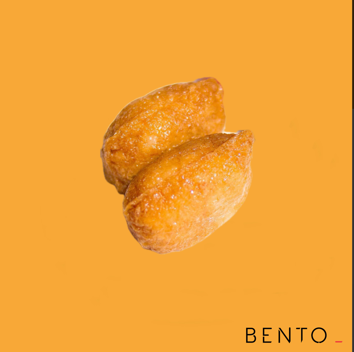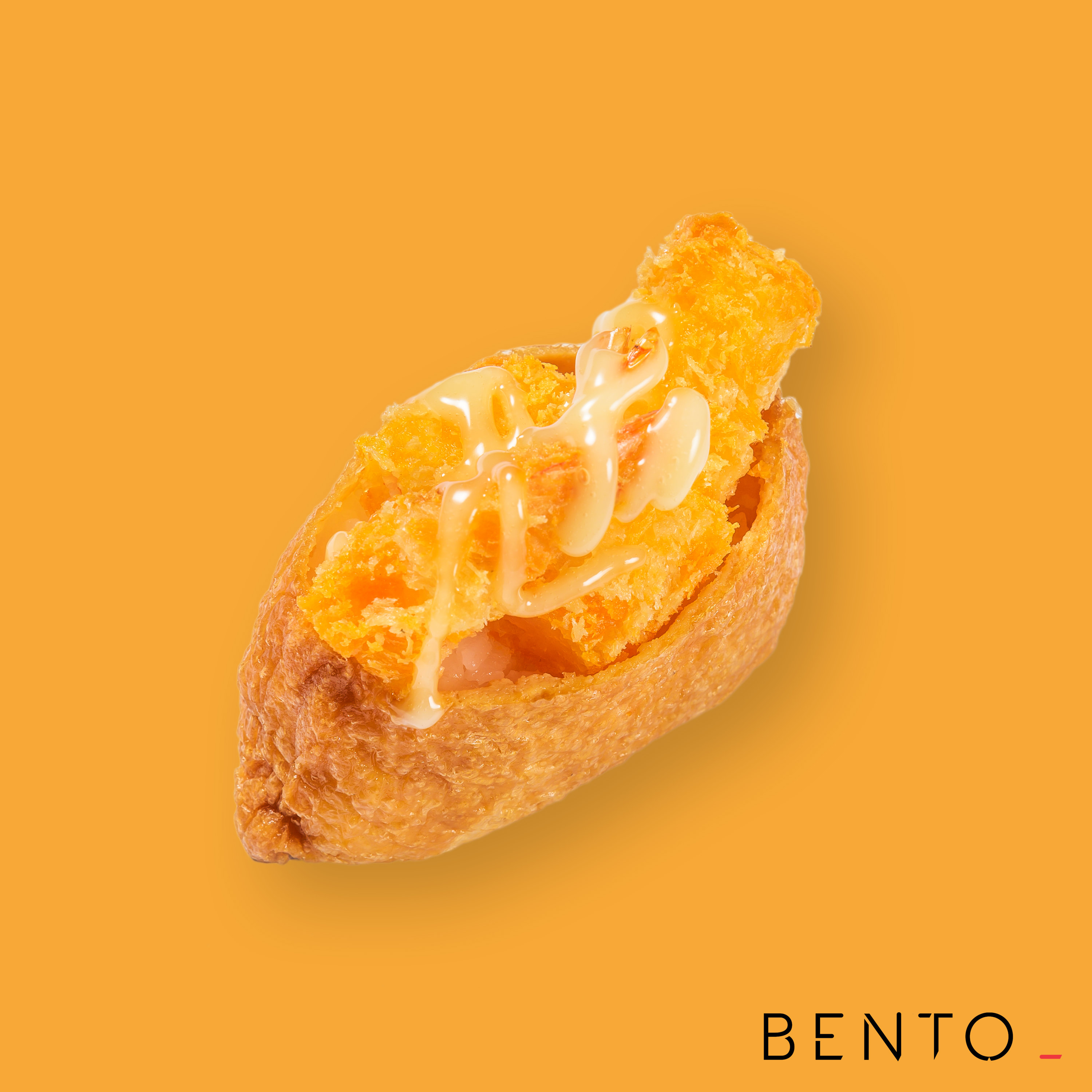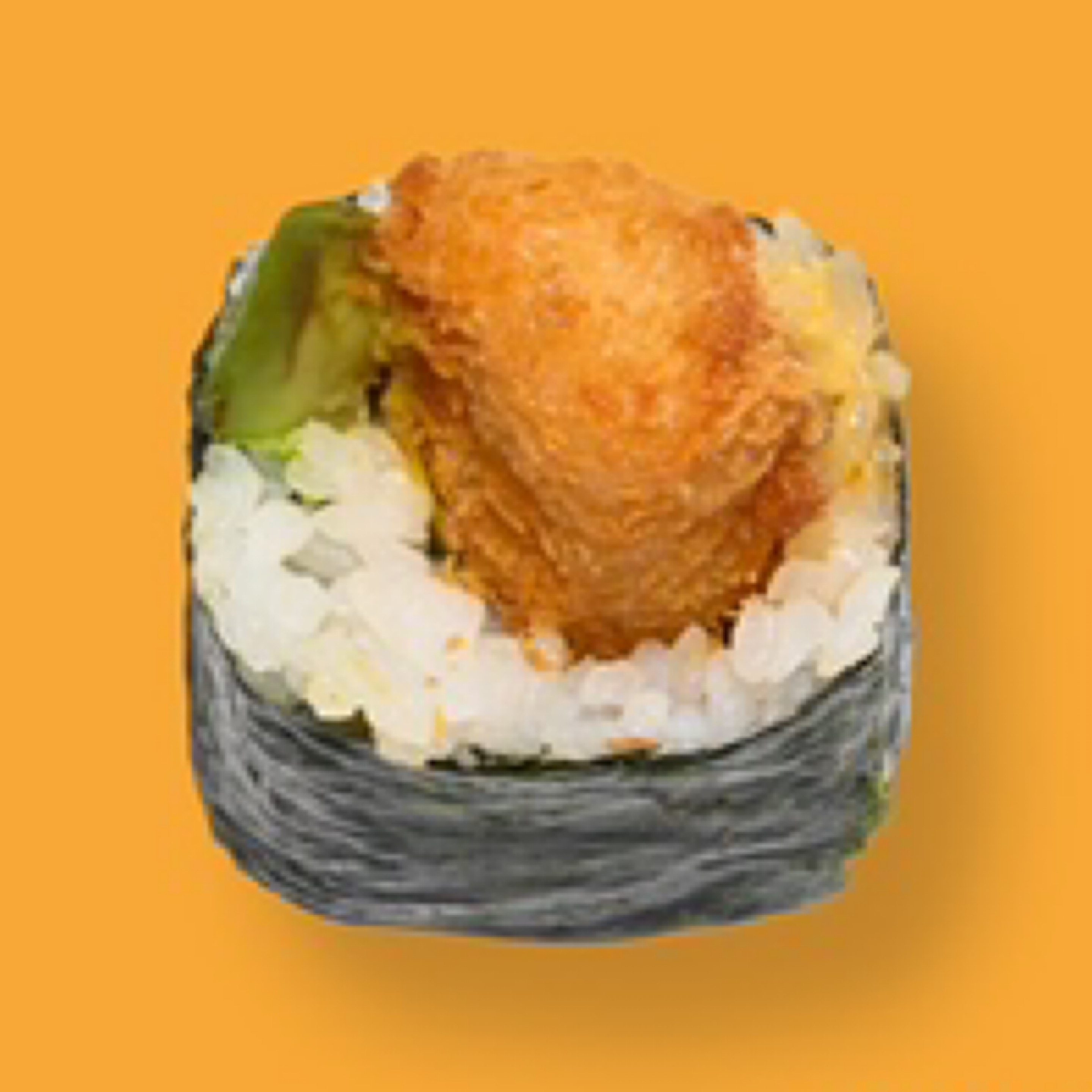 Fried prawn in a sushi rice filled Japanese sweet tofu pocket topped with Bento aurora sauce.