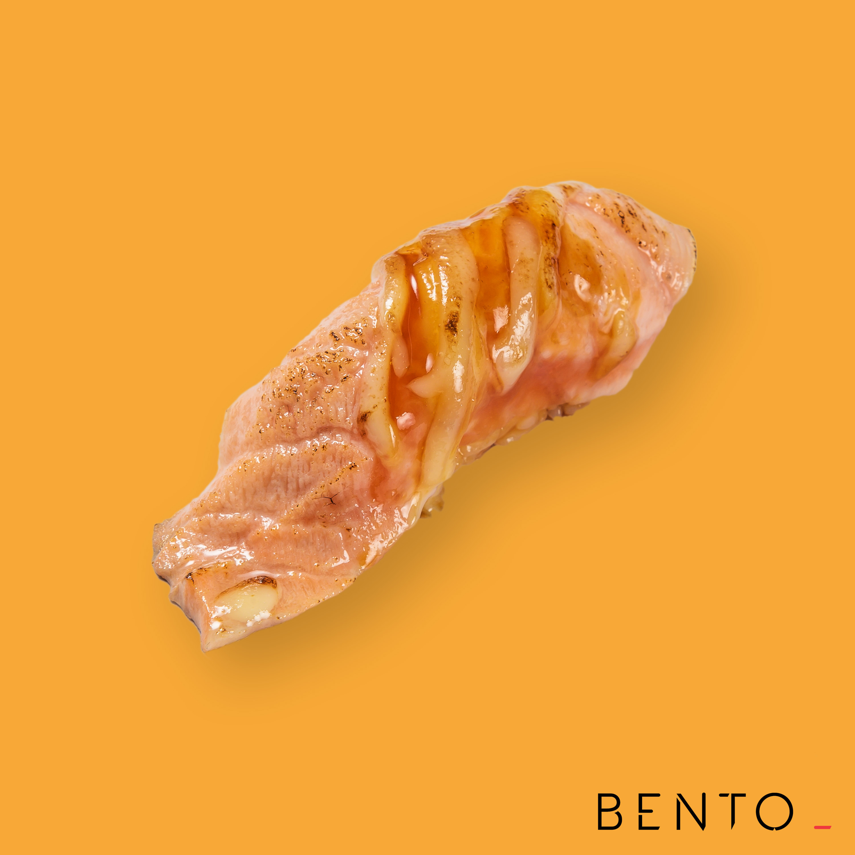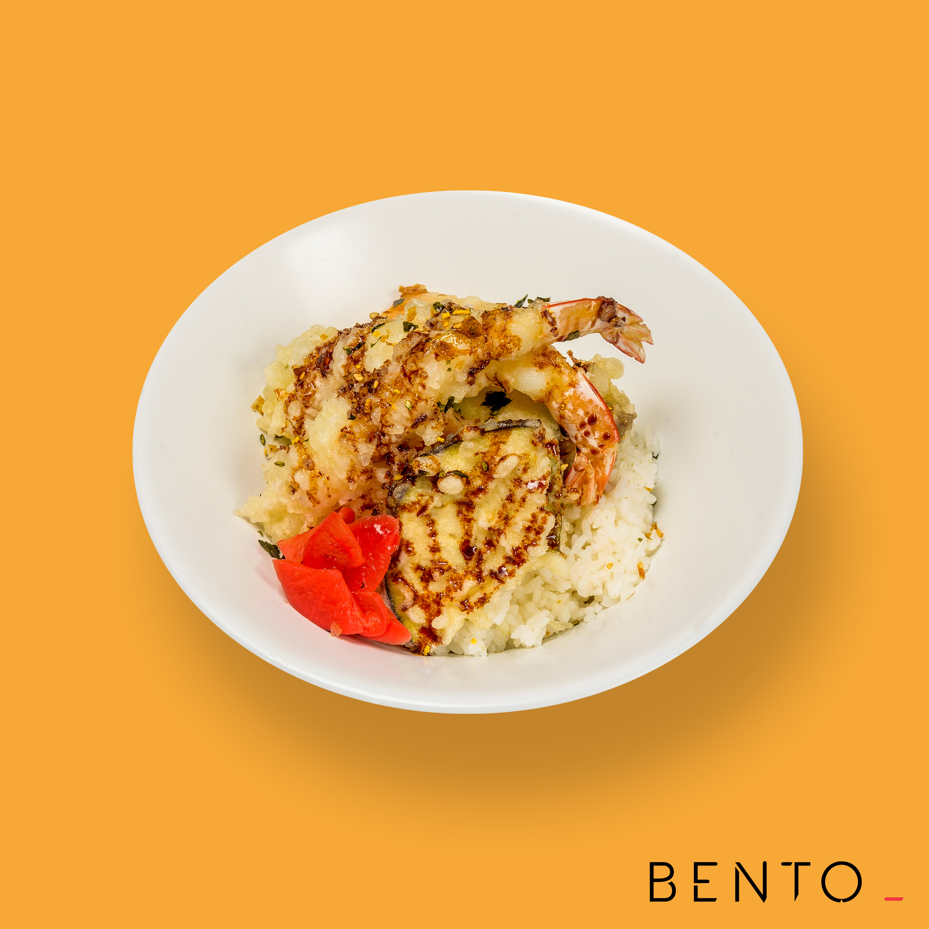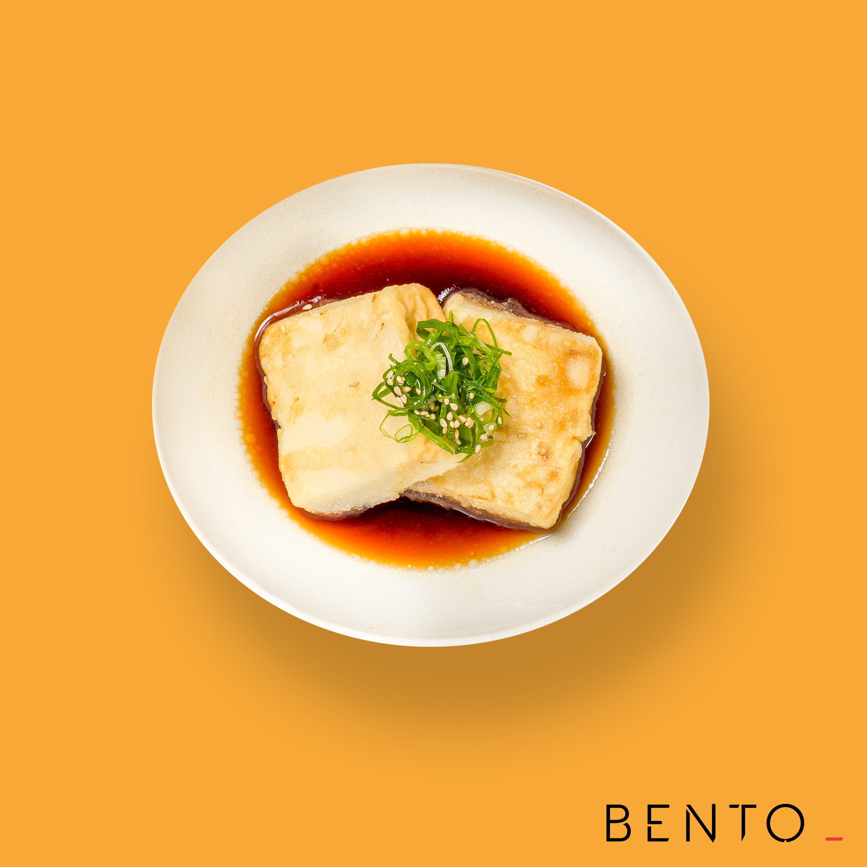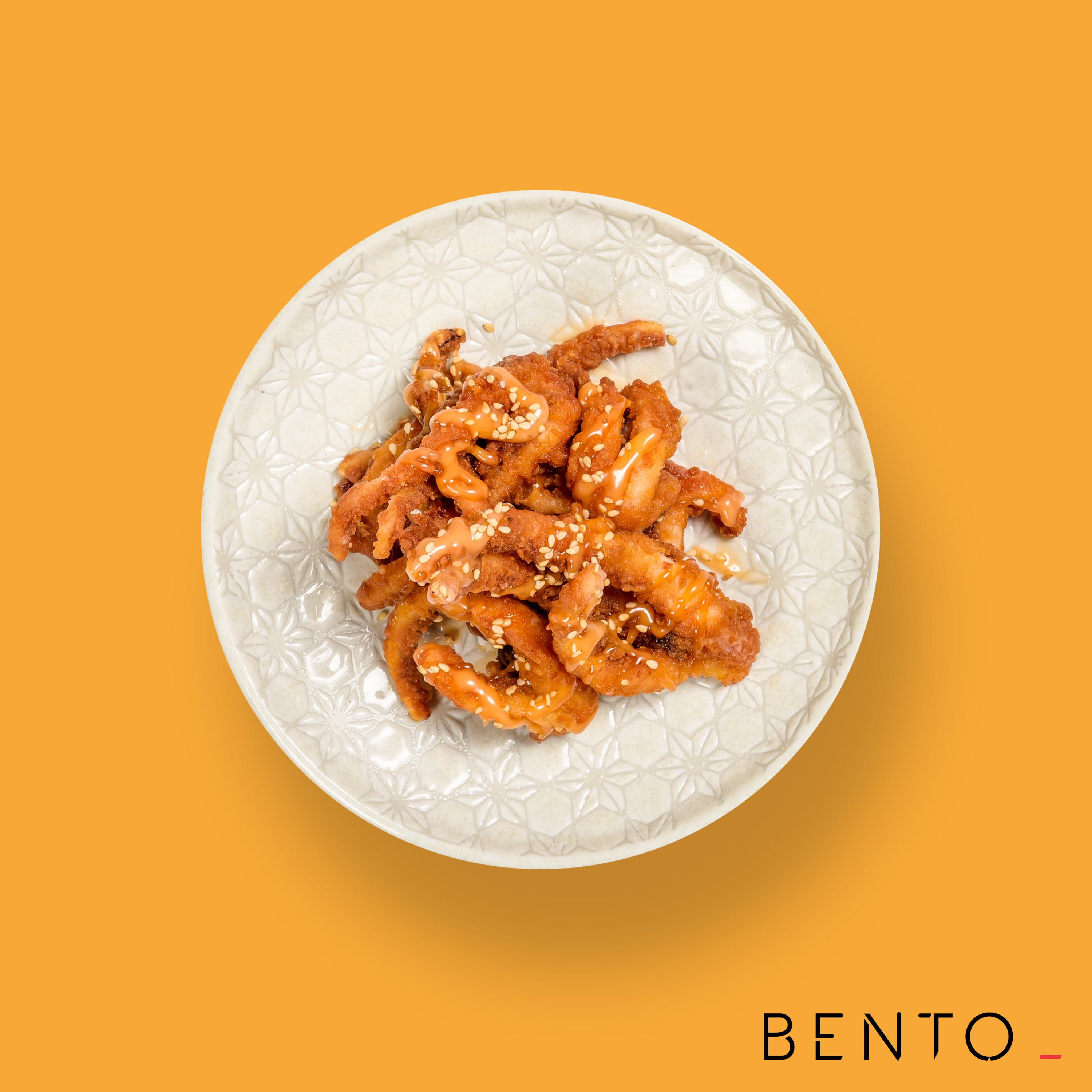 Fried prawn in a sushi rice filled Japanese sweet tofu pocket topped with Bento aurora sauce.