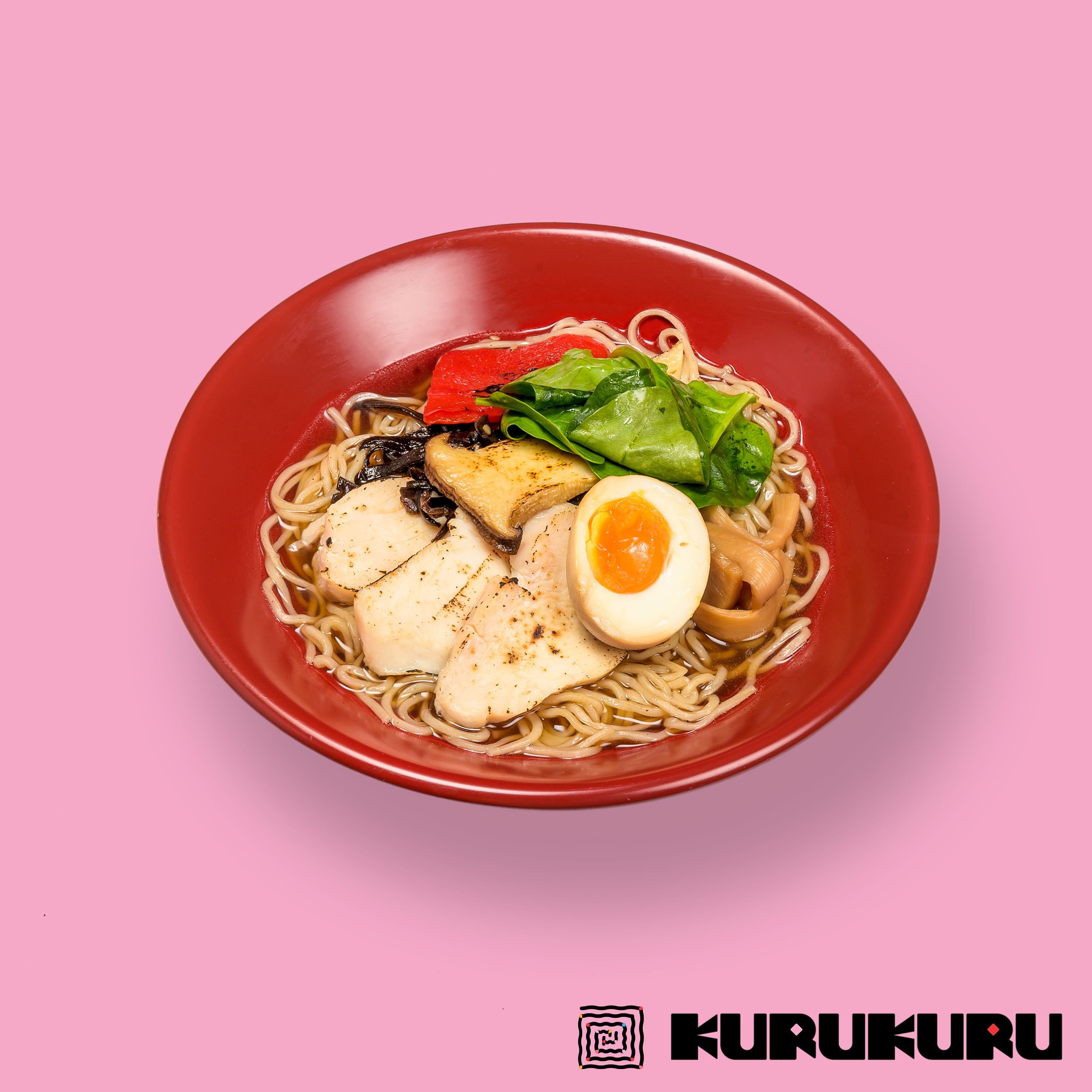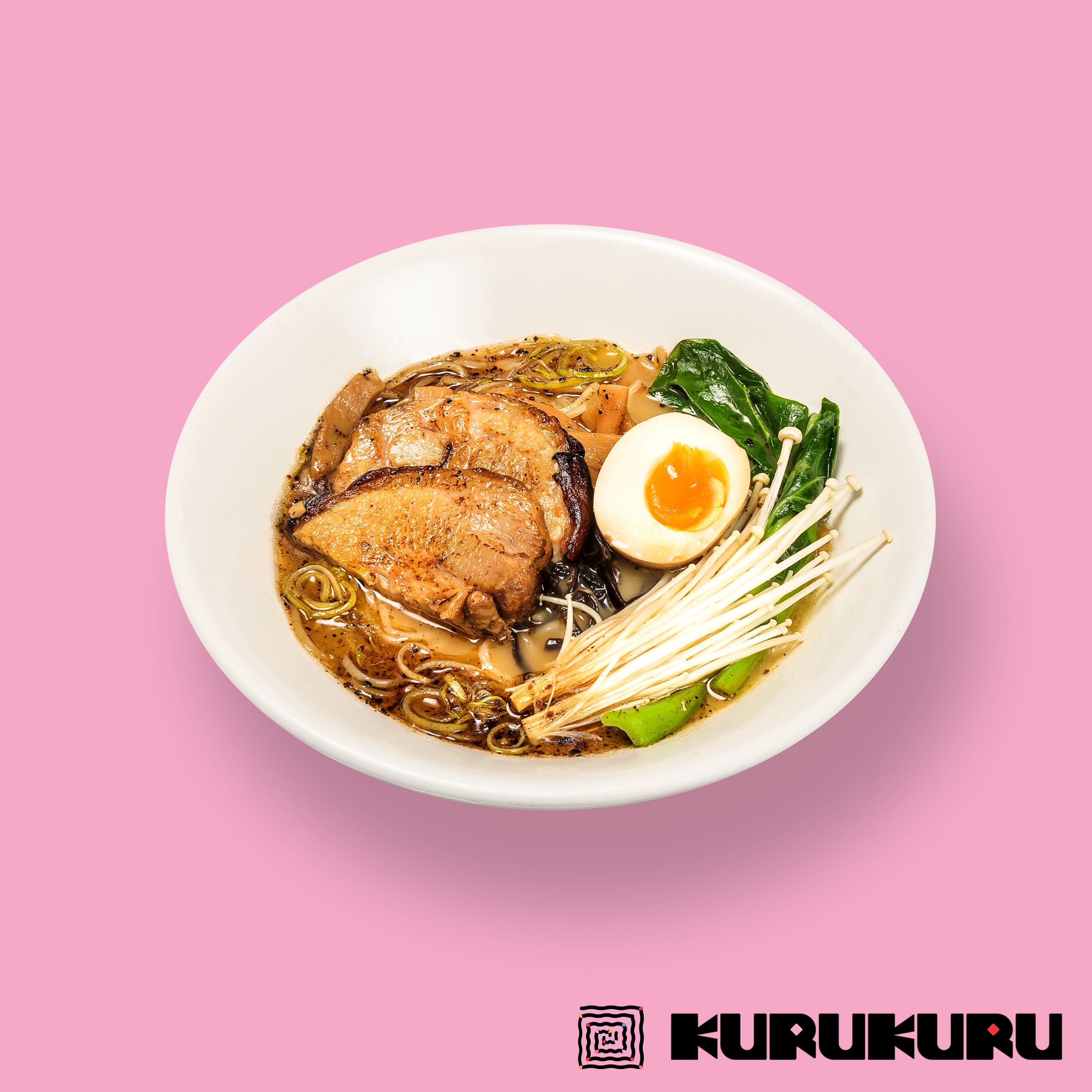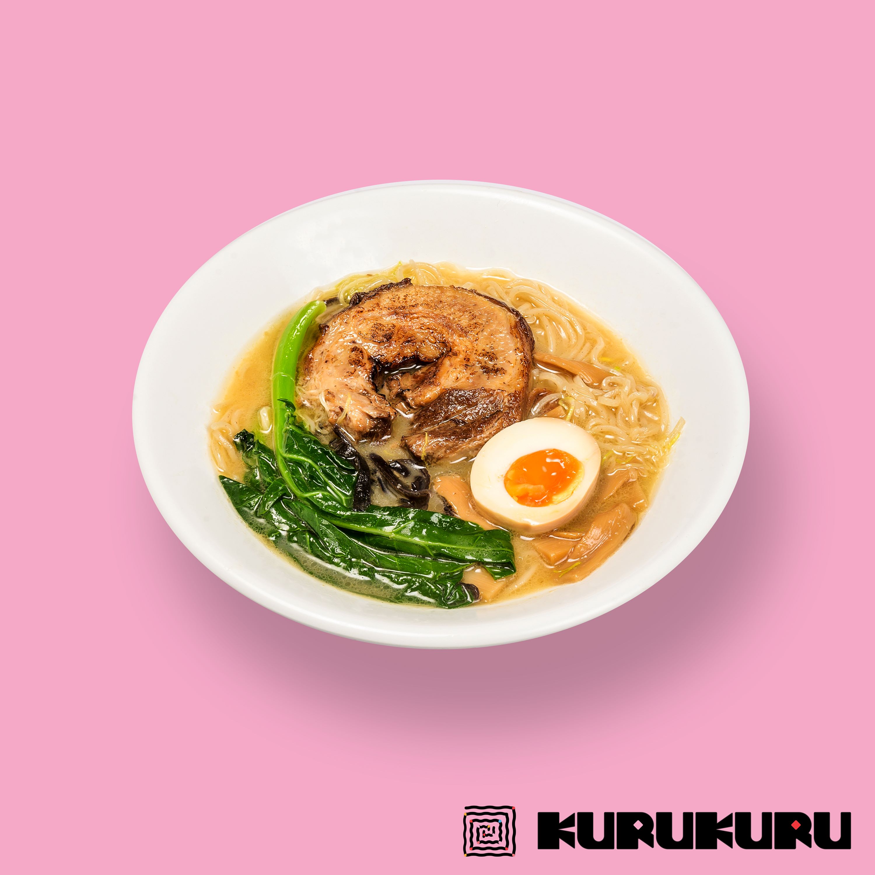 Pork and seafood broth dressed with marinated egg, menma, spring onions, roasted kale, green vegetables, corn kernels and pork mince.