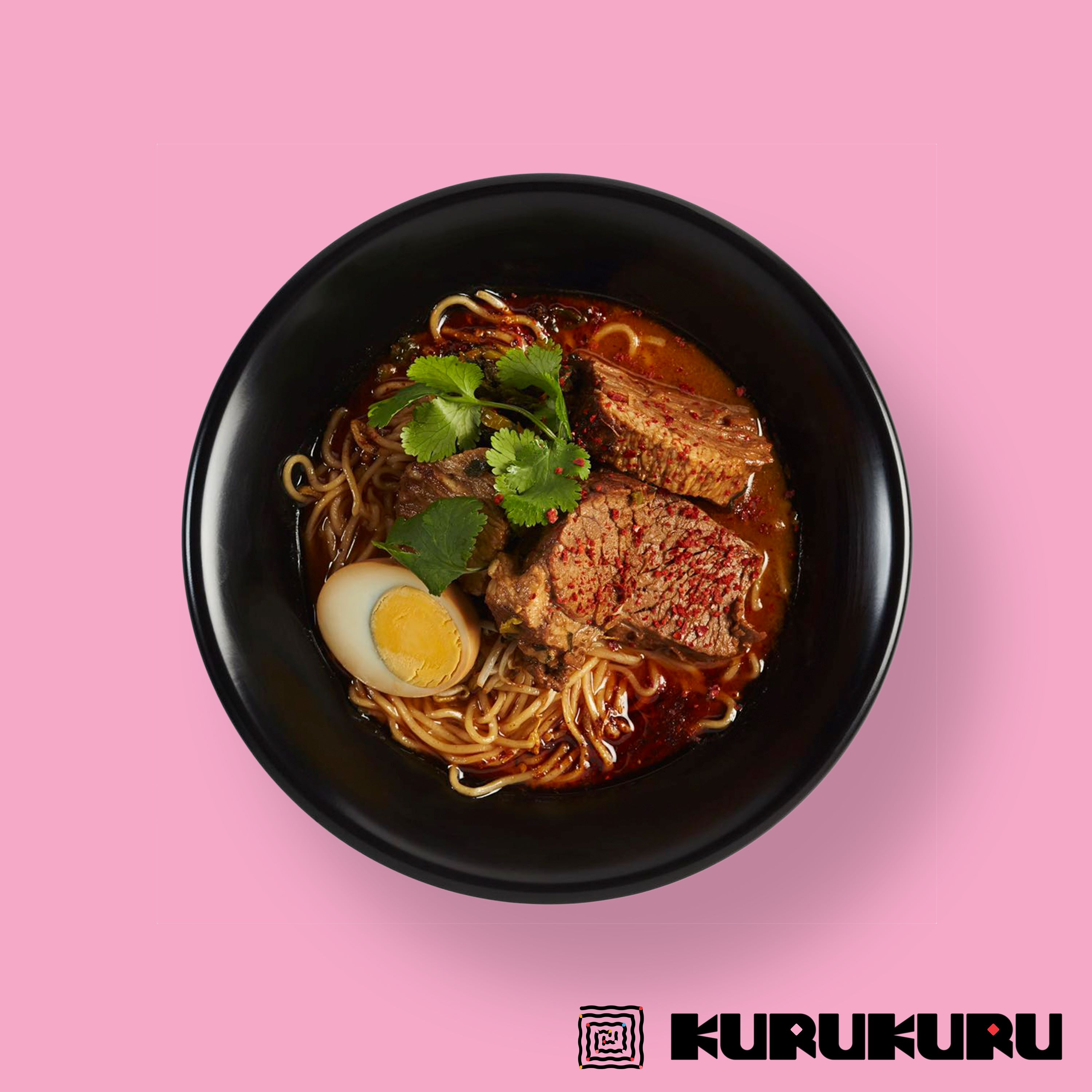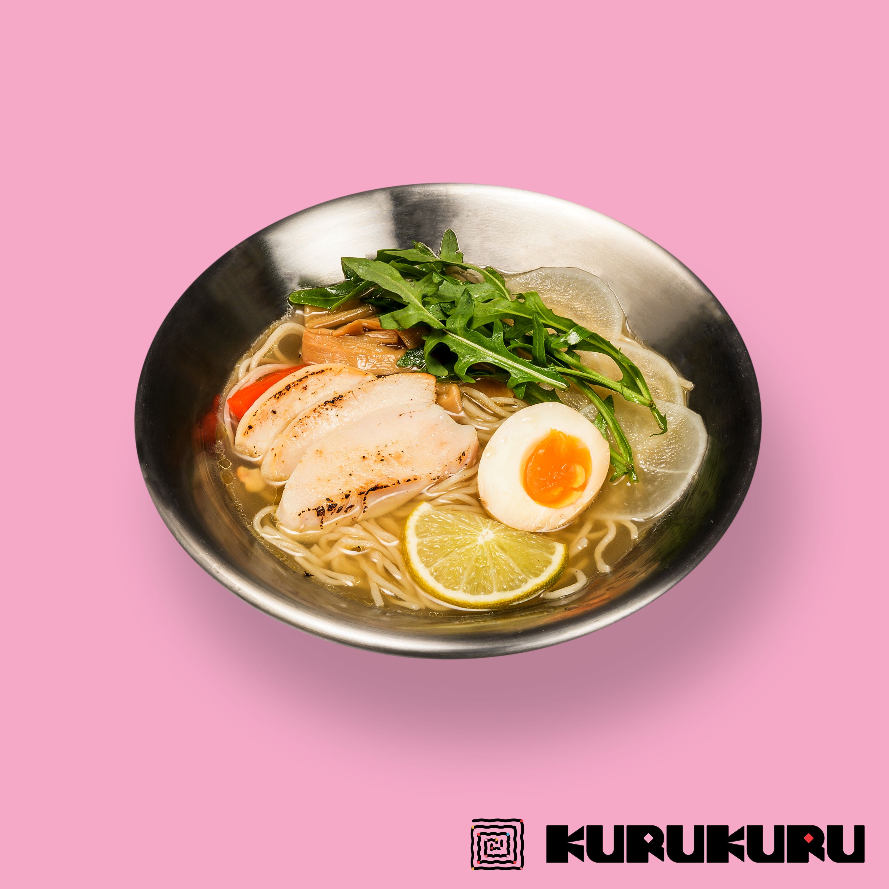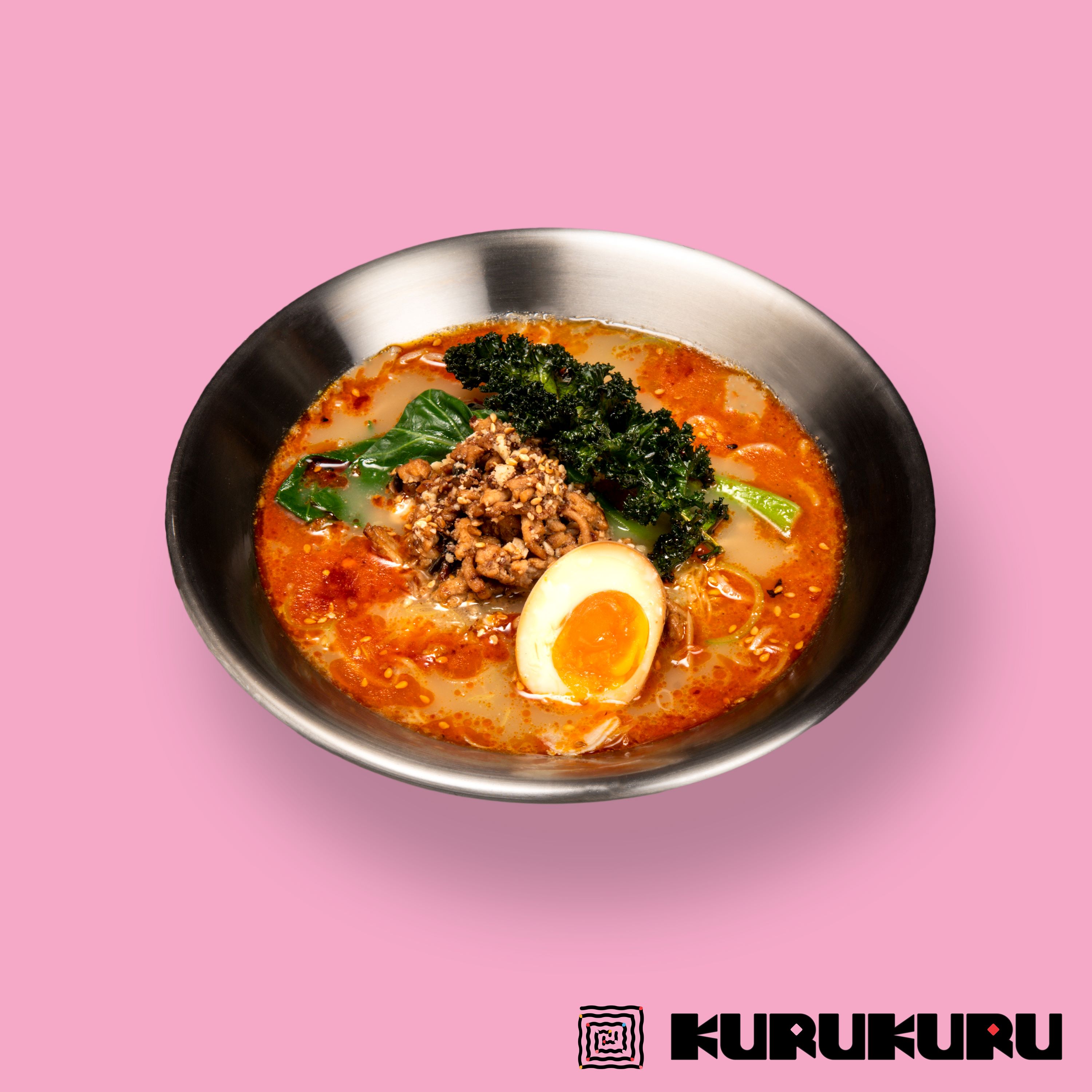 Pork and seafood broth dressed with marinated egg, menma, spring onions, roasted kale, green vegetables, corn kernels and pork mince.