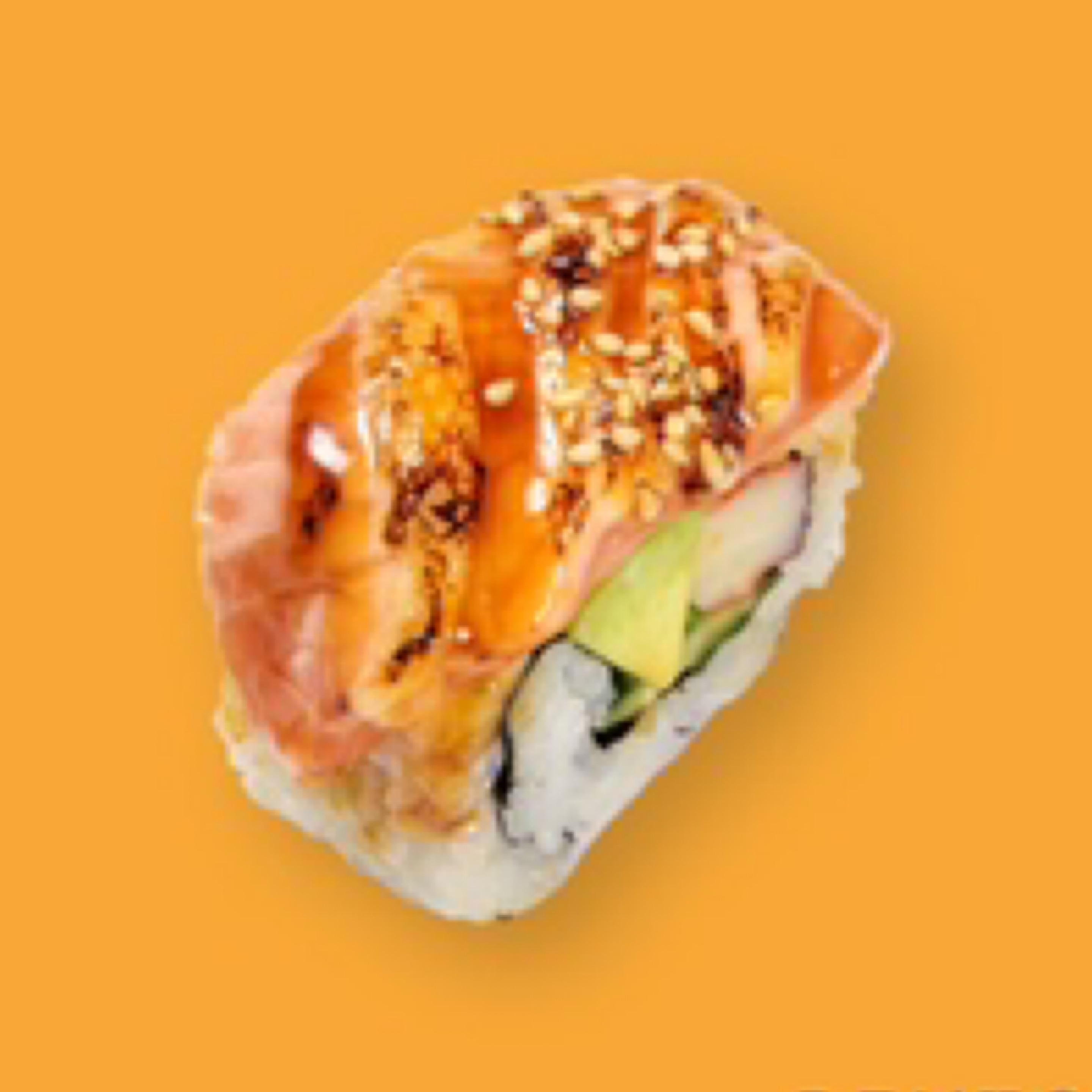 Pan fried teriyaki chicken rolled with cucumber and avocado with teriyaki sauce on top