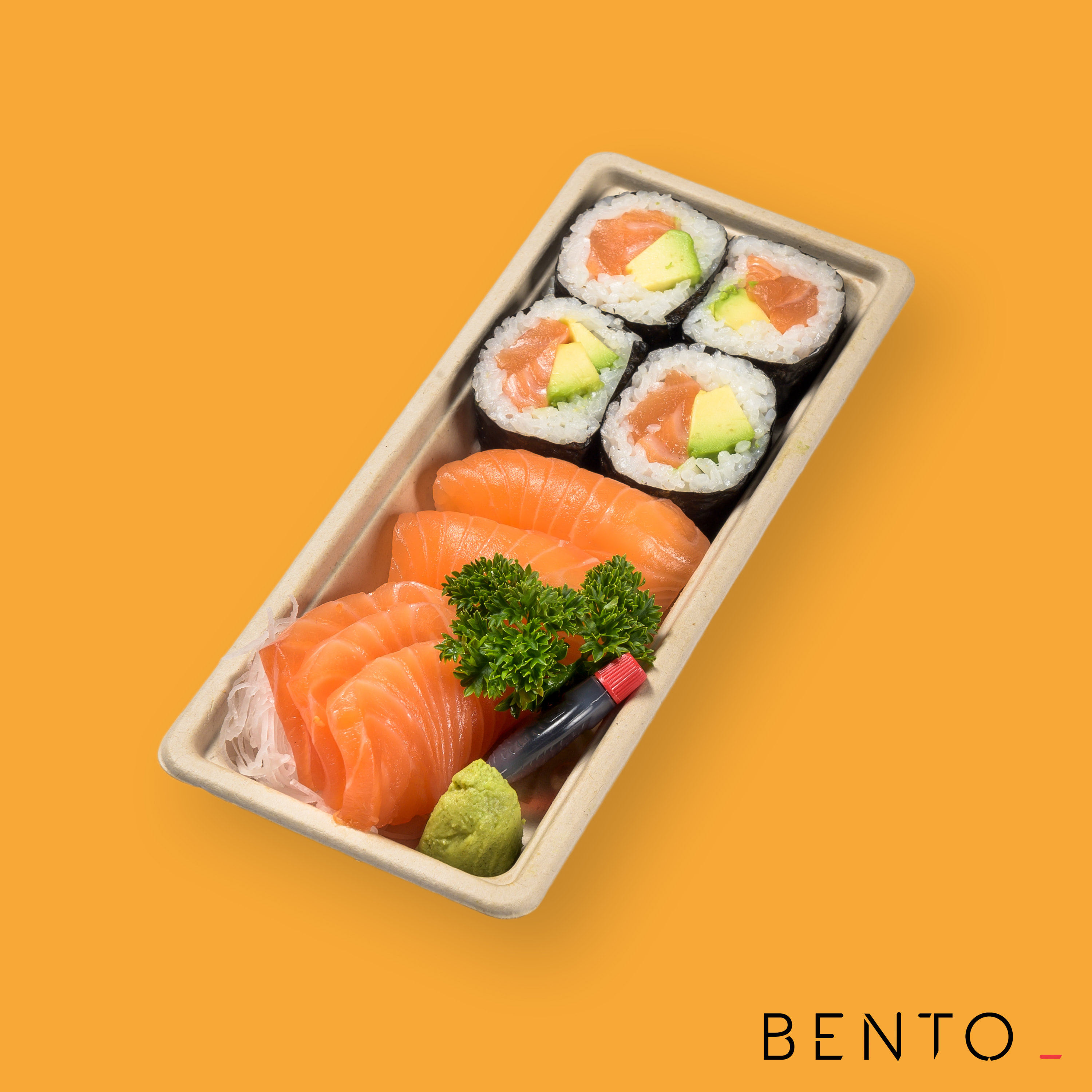 3 pieces of fresh salmon sashimi slice, 4 pieces of salmon avocado roll and 2 pieces of fresh salmon nigiris