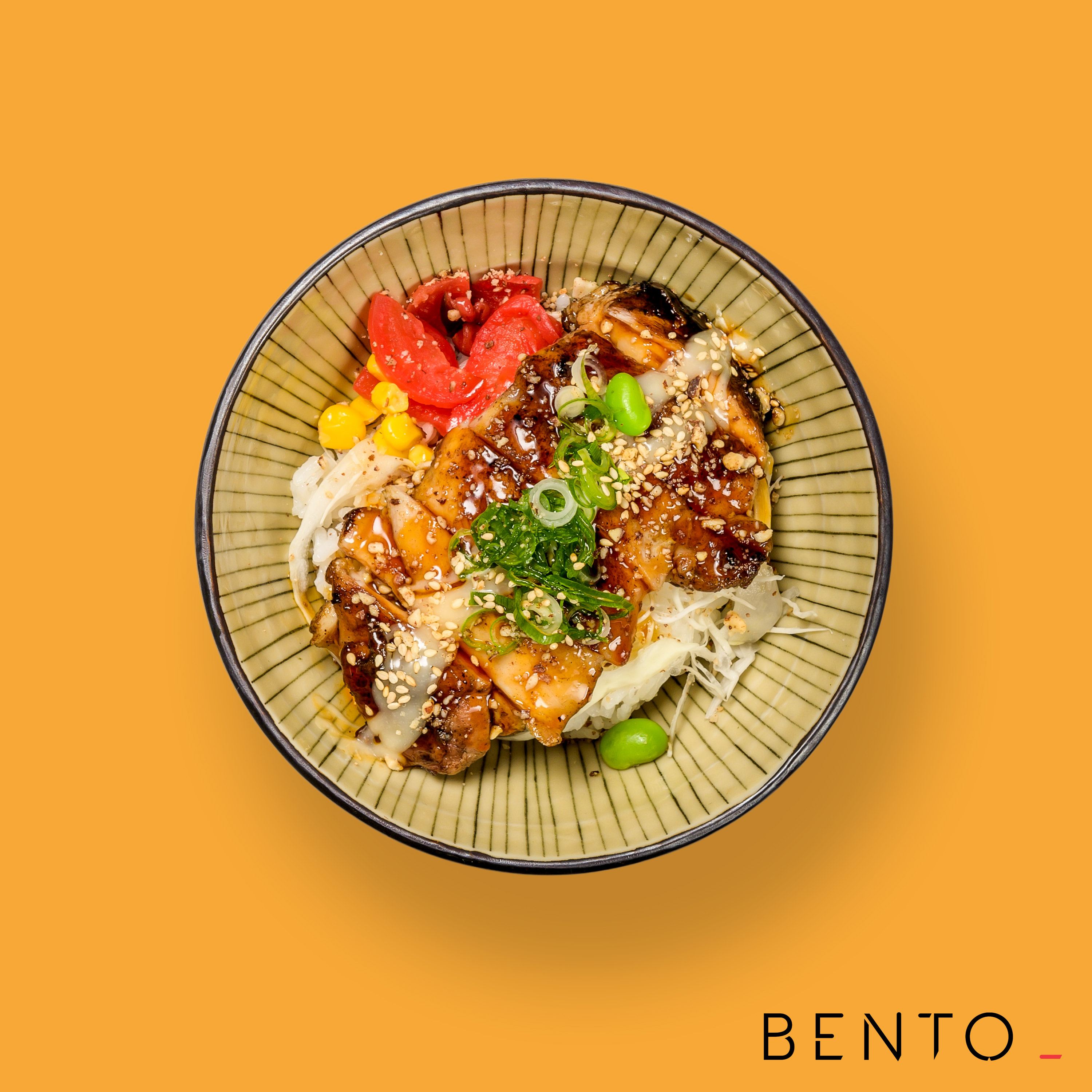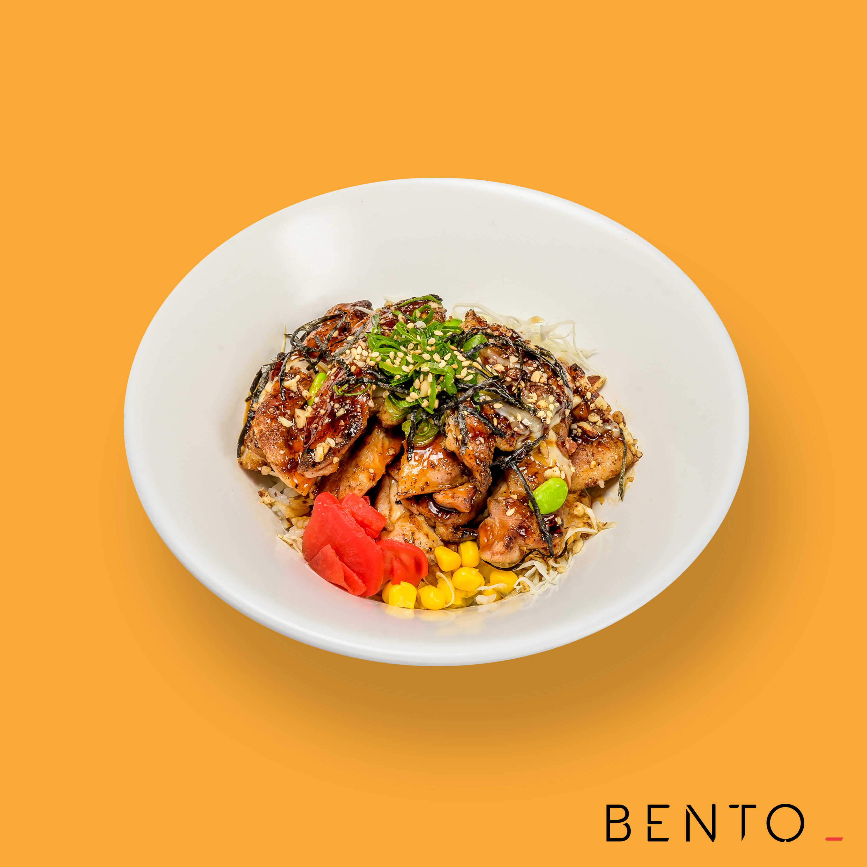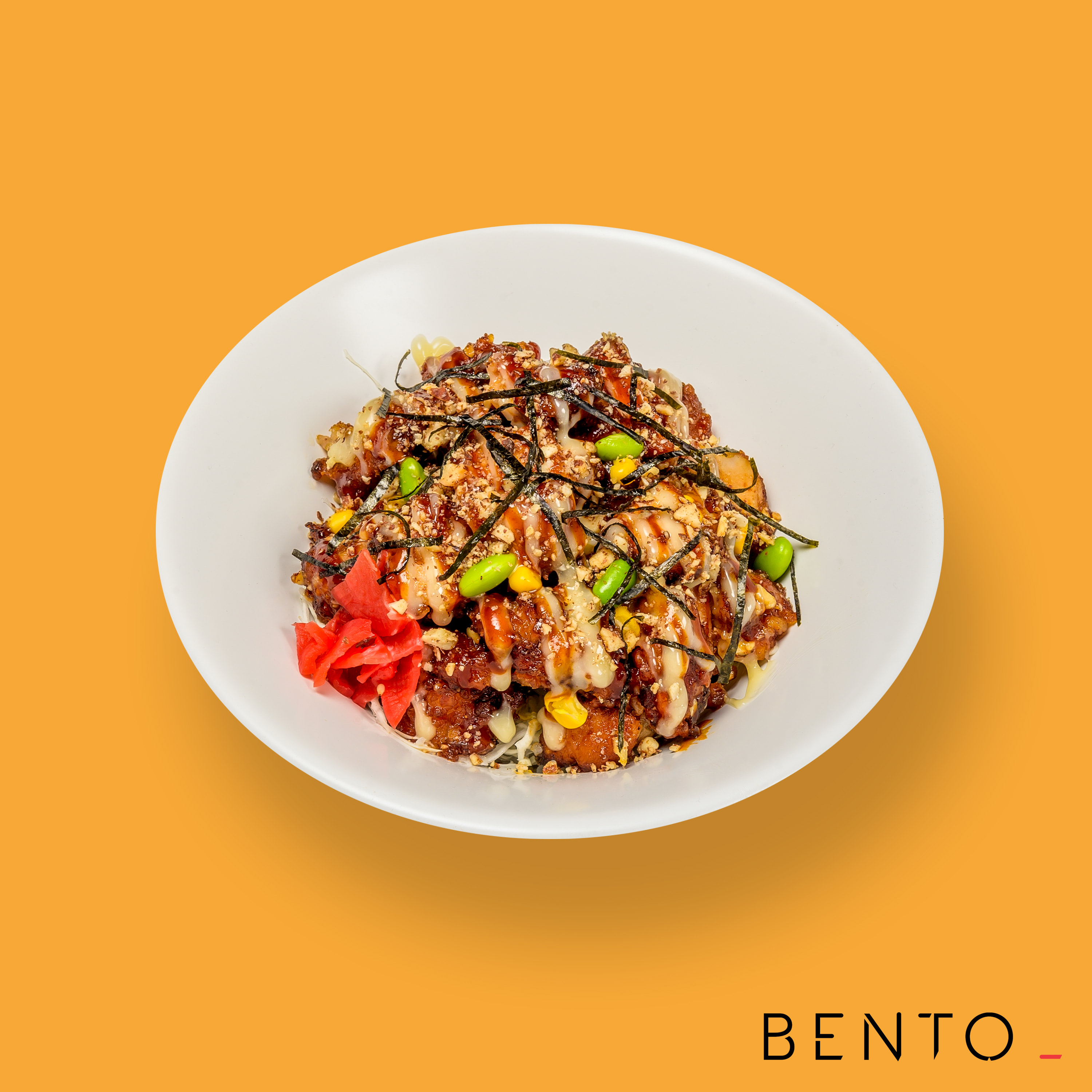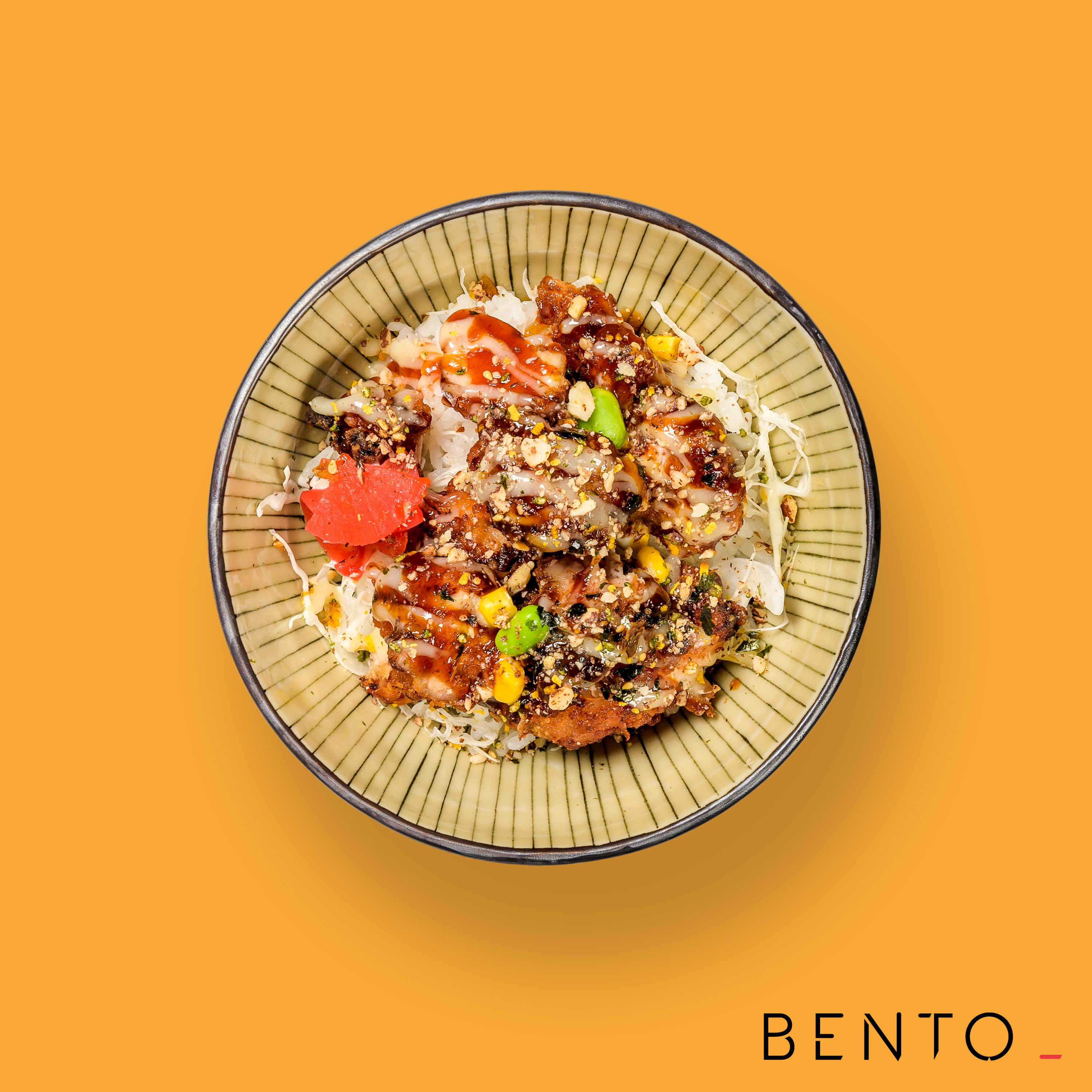 Fried bread crumbed chicken with Bento katsu sauce on top and served on the rice in a small bowl.