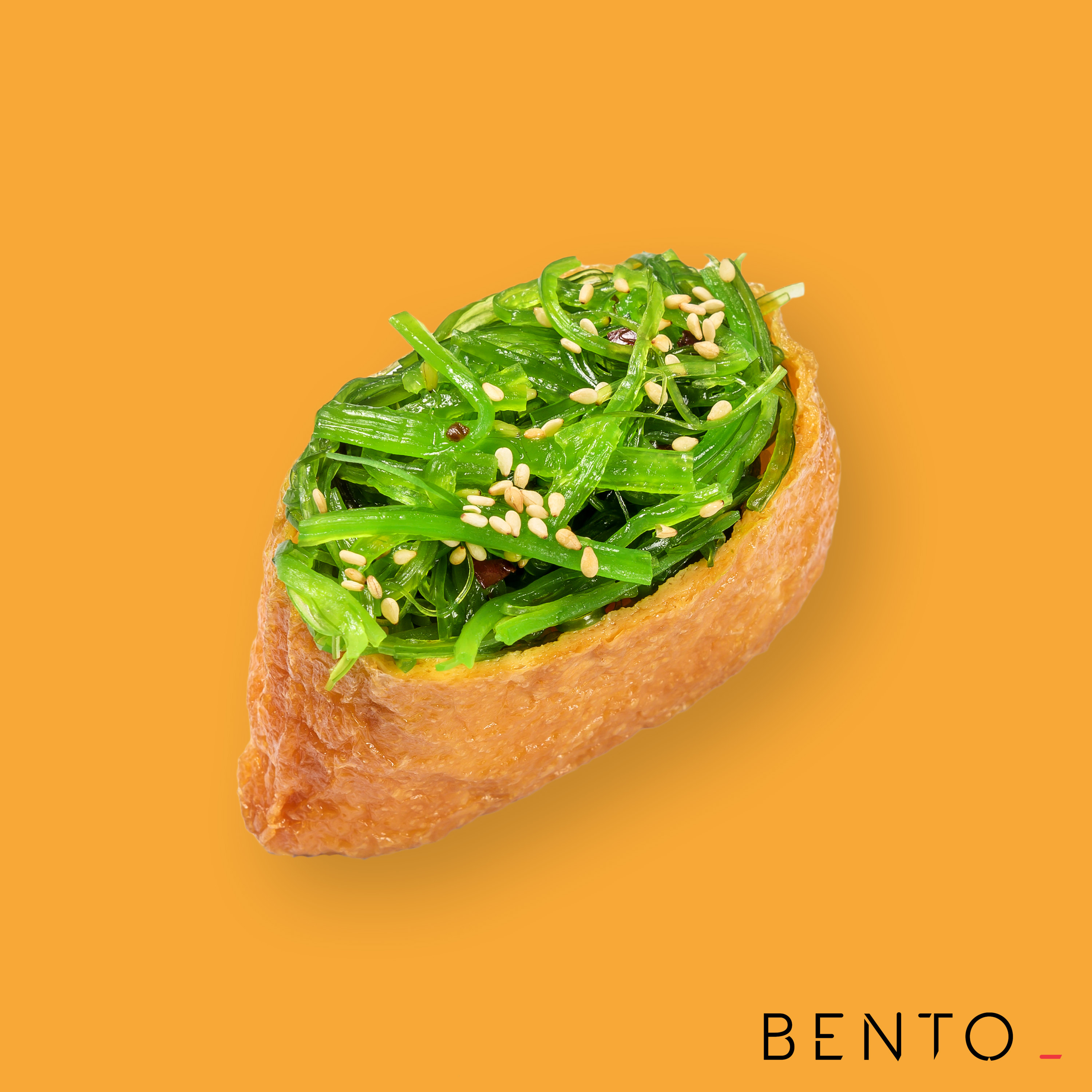 Wakame salad in a sushi rice filled Japanese sweet tofu pocket.