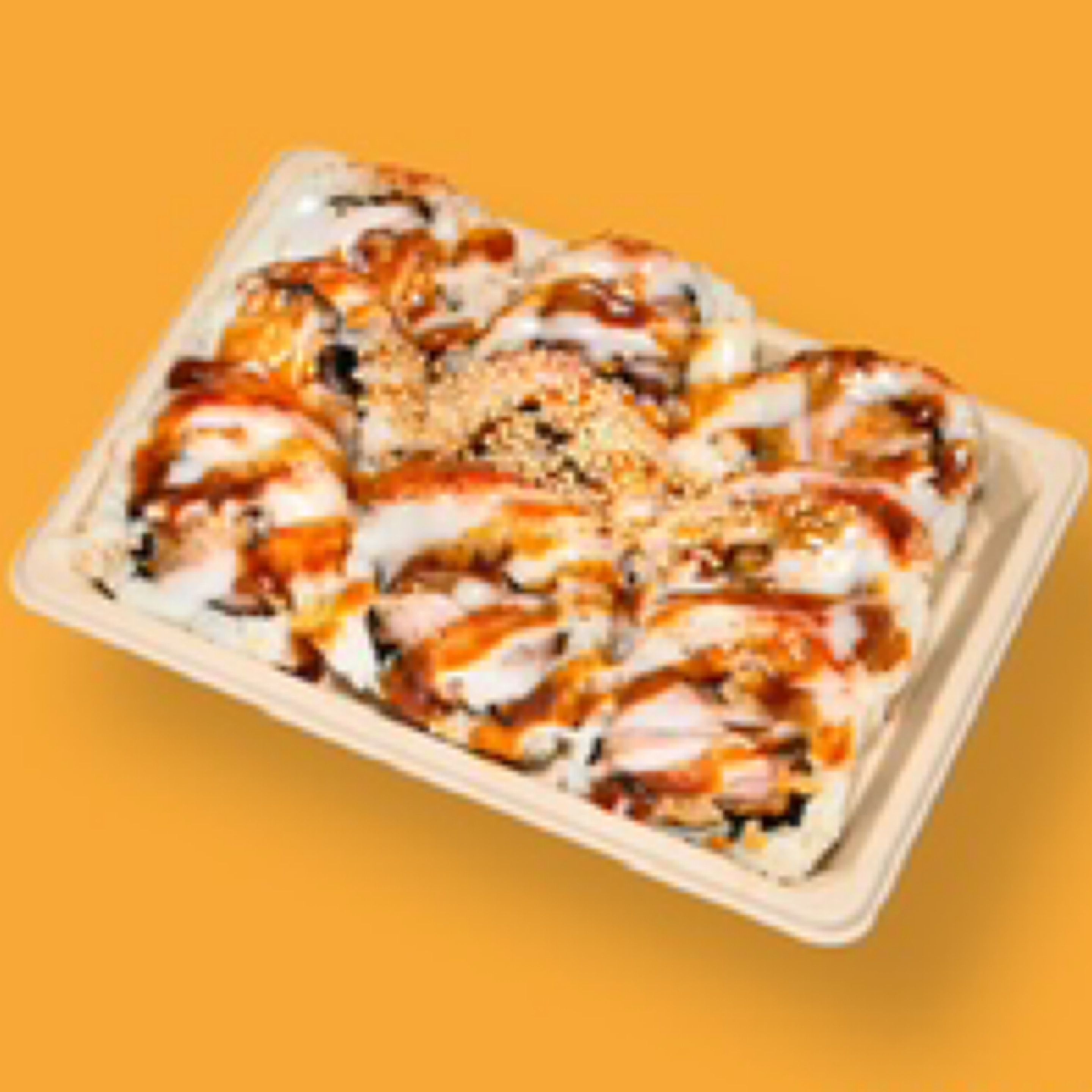 3 pieces of fried chicken roll topped with mayonnaise and mild chili sauce, 3 pieces of teriyaki chicken roll and 3 pieces of yakiniku beef roll topped with mayonnaise and teriyaki sauce. Almond crushes on top.